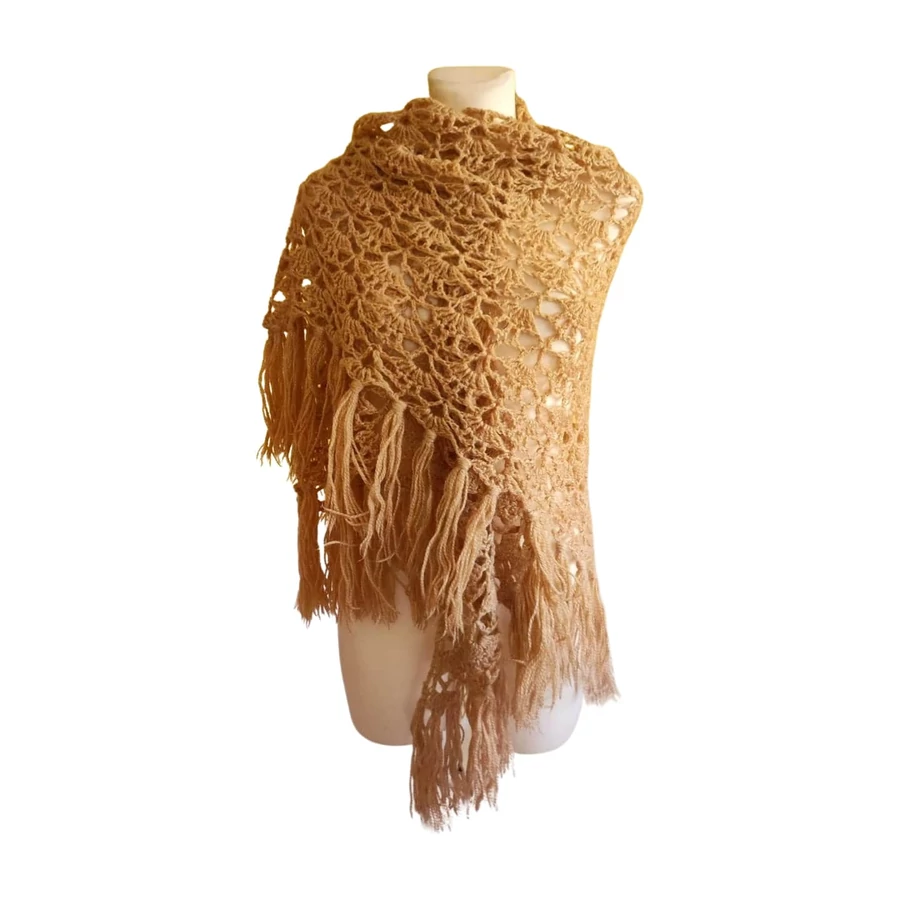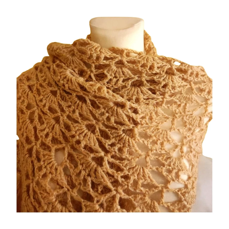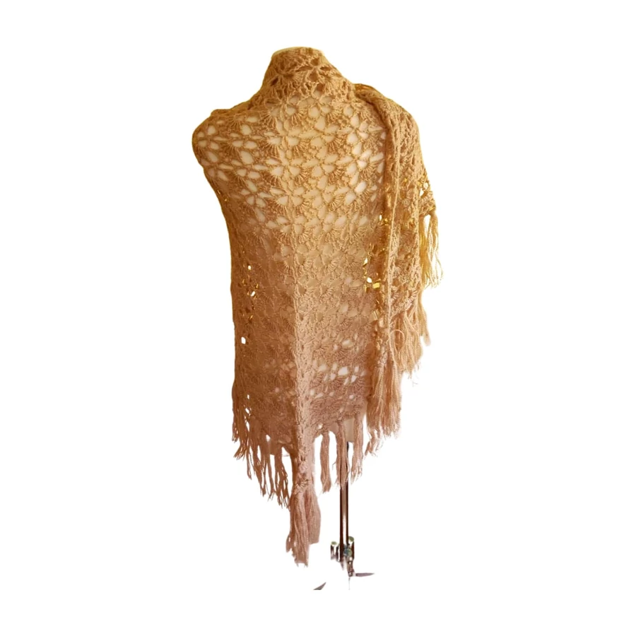 Ez a bézs színű horgolt női kendő egy nagyon szép, praktikus és meleg kiegészítő, amely nagyobb mérete miatt többféle módon hordható. A színe kellemes és jól kombinálható több stílusú ruhadarabbal. Anyaga vastag, kötött, így nem csak átmeneti időben érdemes hordani. A fazonja klasszikus háromszög megoldású.