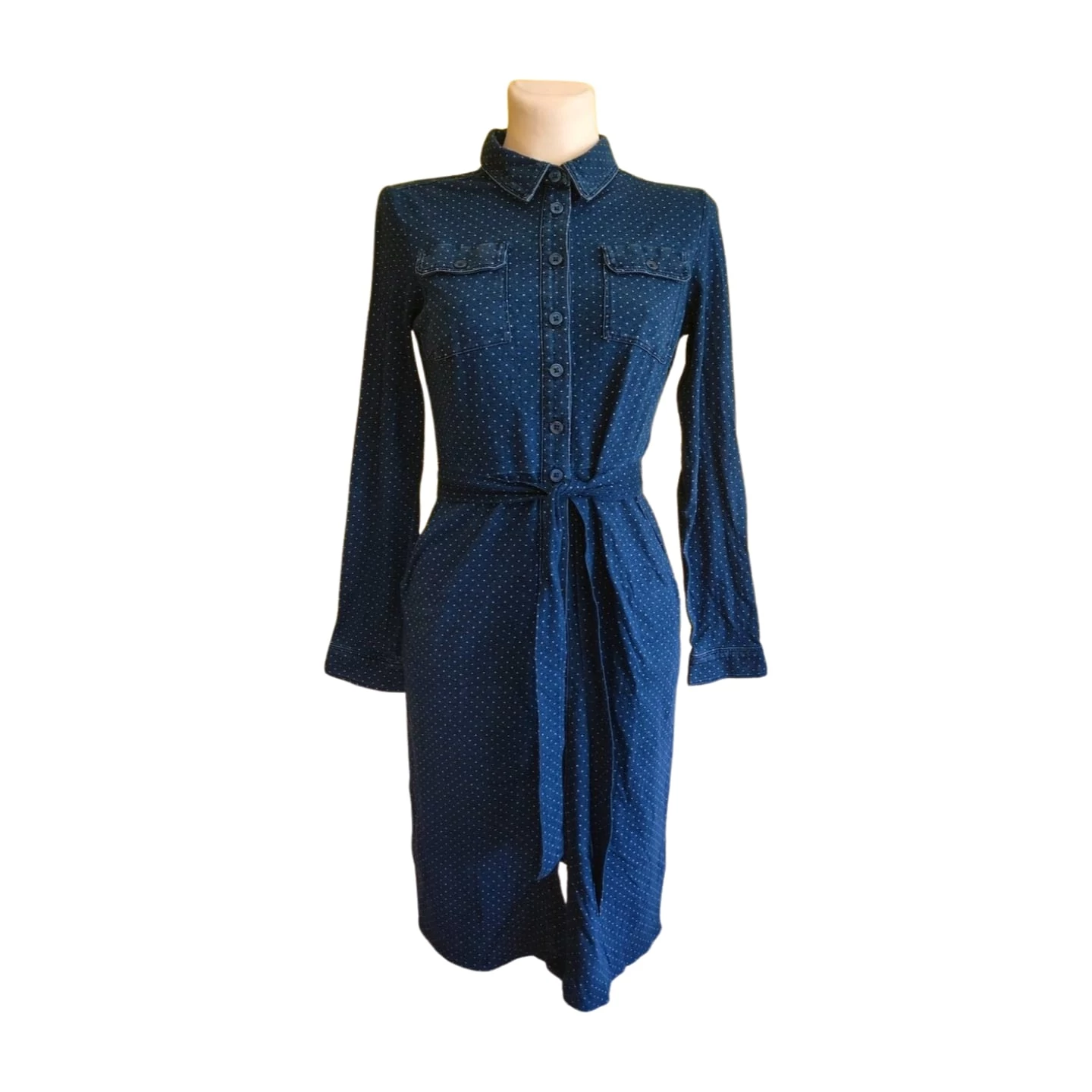 Ez a Boden sötétkék pöttyös női ingruha egy nagyon csinos, nőies darab. Anyaga puha elasztikus, pamut. Hosszú ujjú fazonja mellett szoknyája egyenes vonalvezetésű. Ujja felhajtható, felgombolható. Jól kombinálható hétköznapi és finomabb darabokkal. A hétköznapokban is vidám, csajos megjelenést biztosít. Ez a darab átlagos alkatú hölgyeknek ajánlott.