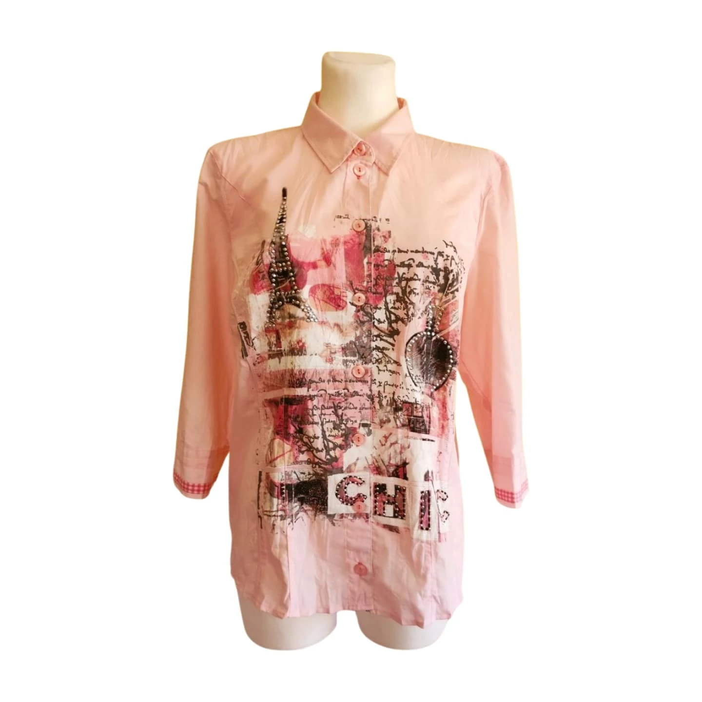 Ez a Bonita rózsaszín Párizs mintás női blúz egy csinos, nőies darab, amely kombinálható több stílusú ruhadarabbal, legyen az laza vagy elegánsabb. Puha pamut anyaga kényelmes viseletté teszi. Fazonja klasszikus, lenge stílusú, 3/4-es ujjú. Jól mutat egy farmerrel ugyanúgy, mint egy nőies szett részeként. A mintáját strasszkövek díszítik. Ajánlott átlagos alkatú hölgyeknek.