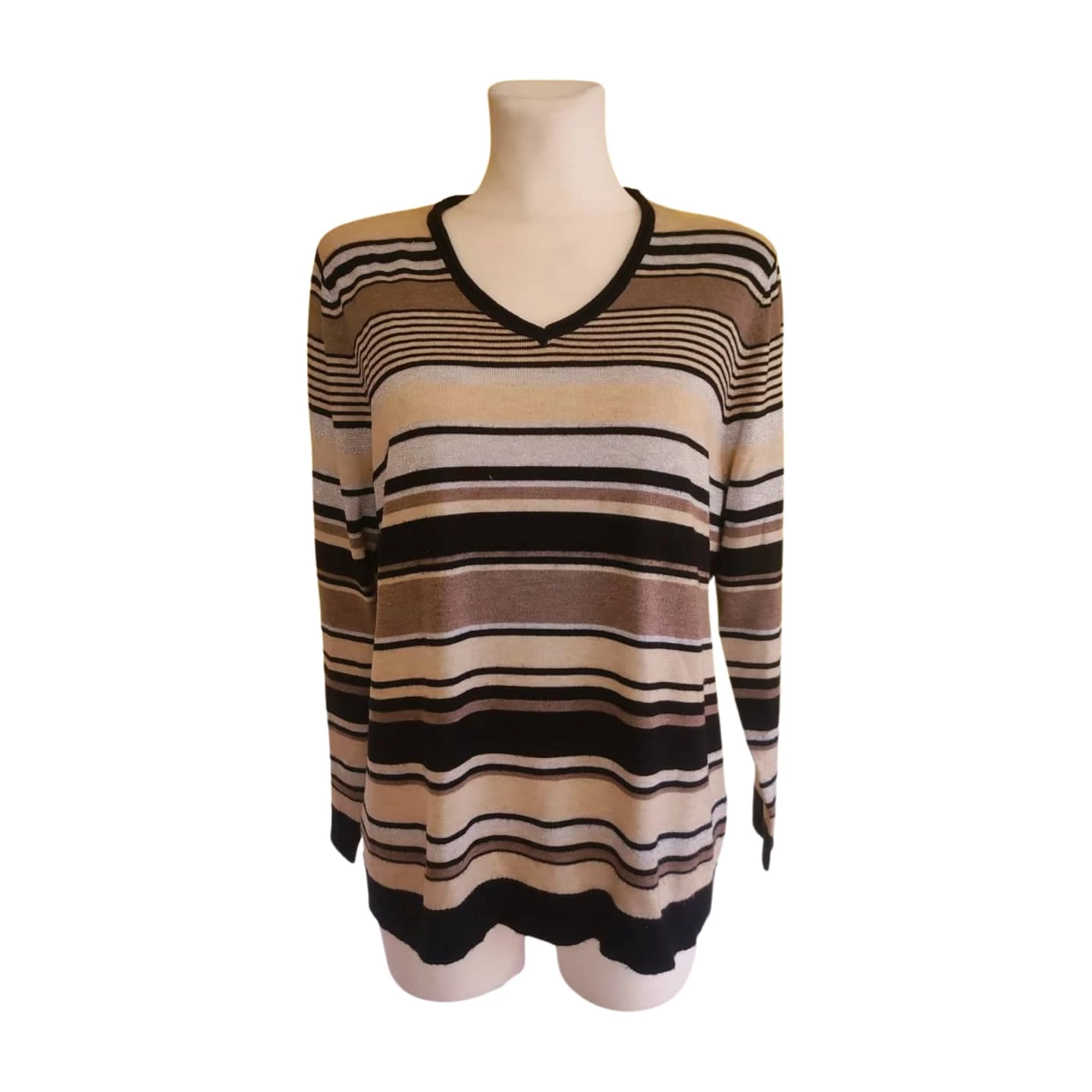 Ez a C&A világosbarna csíkos női pulóver egy remek alapdarab, ami jól kombinálható egy kényelmes farmerrel vagy elegánsabb kiegészítőkkel. Puha, rugalmas, sűrűn kötött anyaga miatt nagyon komfortos viselet. Fazonja klasszikus, V-nyakú. Kiváló választás egy hétköznapi szetthez vagy kikapcsolódáshoz, de nőies kiegészítőkkel is megfelelő. Ajánlott átlagos alkatú hölgyeknek.