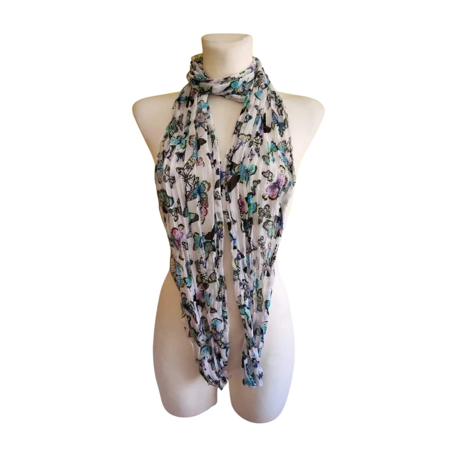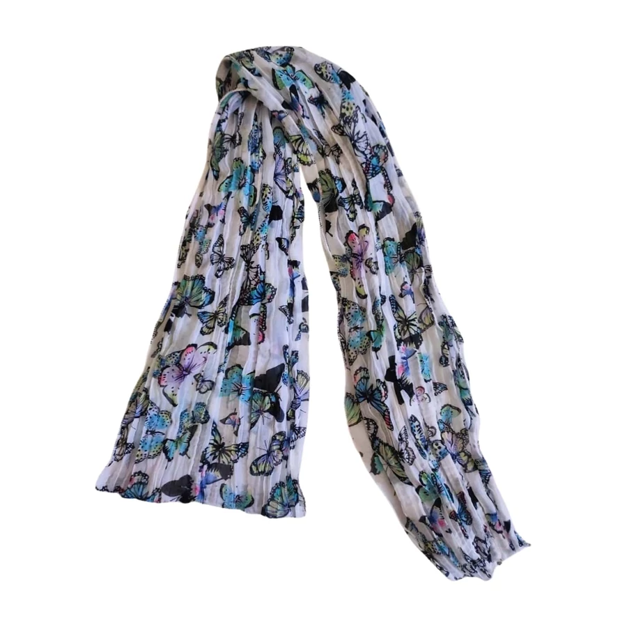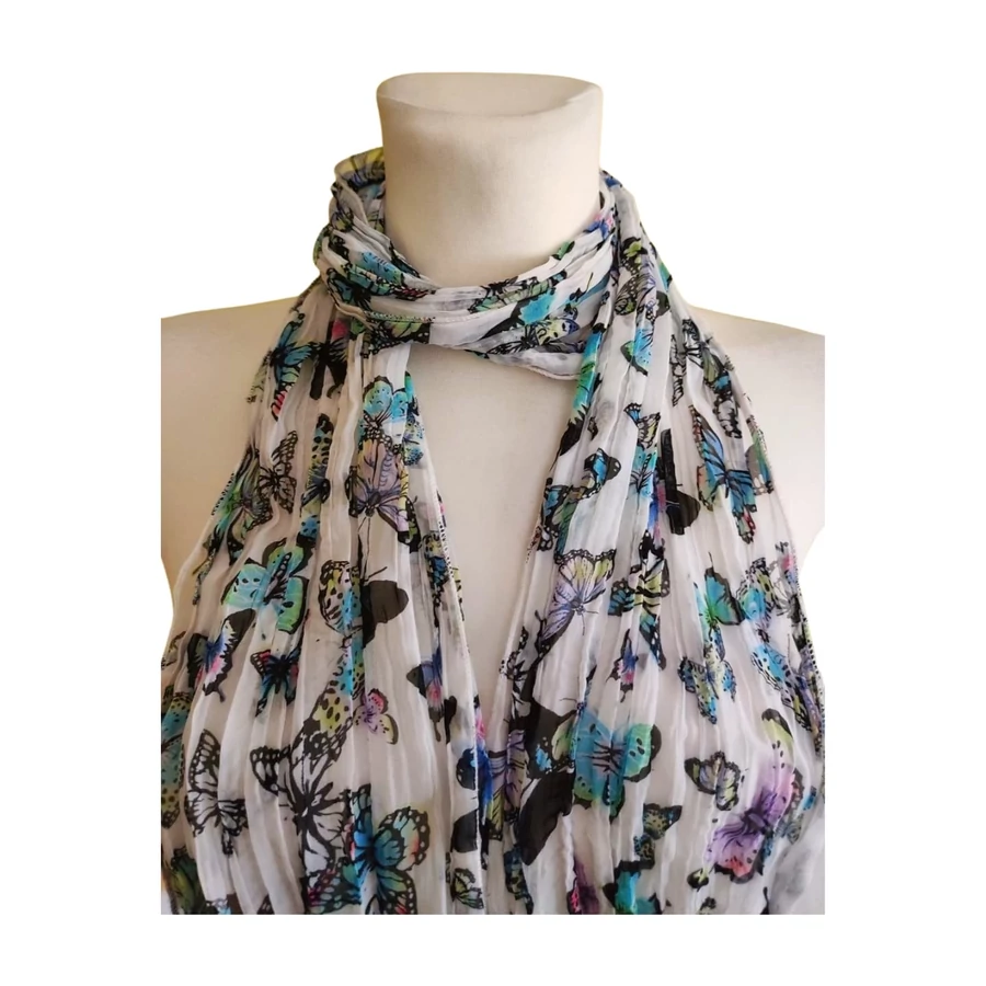 Ez a fehér lepke mintás női vékony sál egy nagyon szép, praktikus kiegészítő, amely hosszabb mérete miatt többféle módon hordható. A színe kellemes, mintája vidám és jól kombinálható több stílusú ruhadarabbal. Anyaga vékony, így inkább az átmeneti időben érdemes hordani.