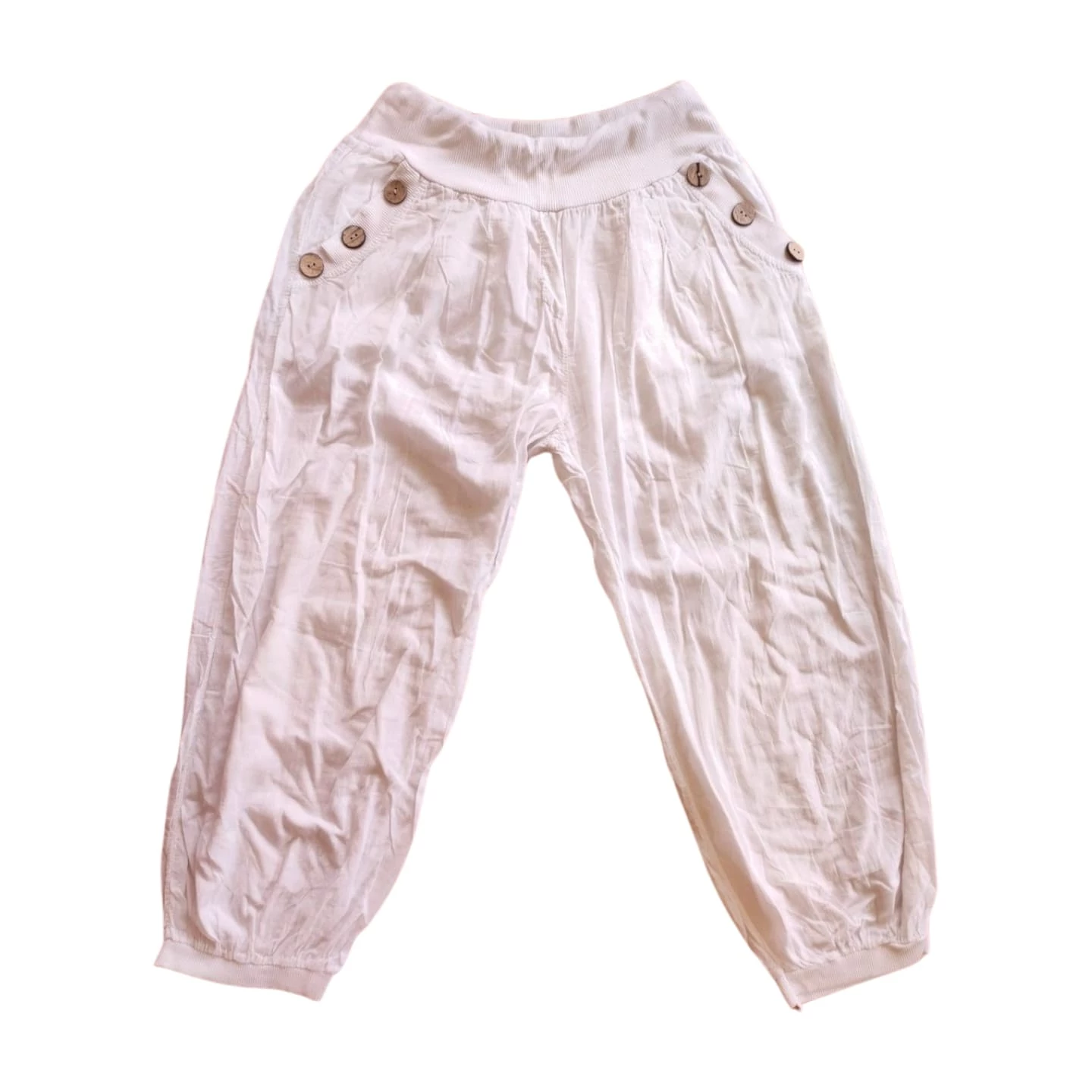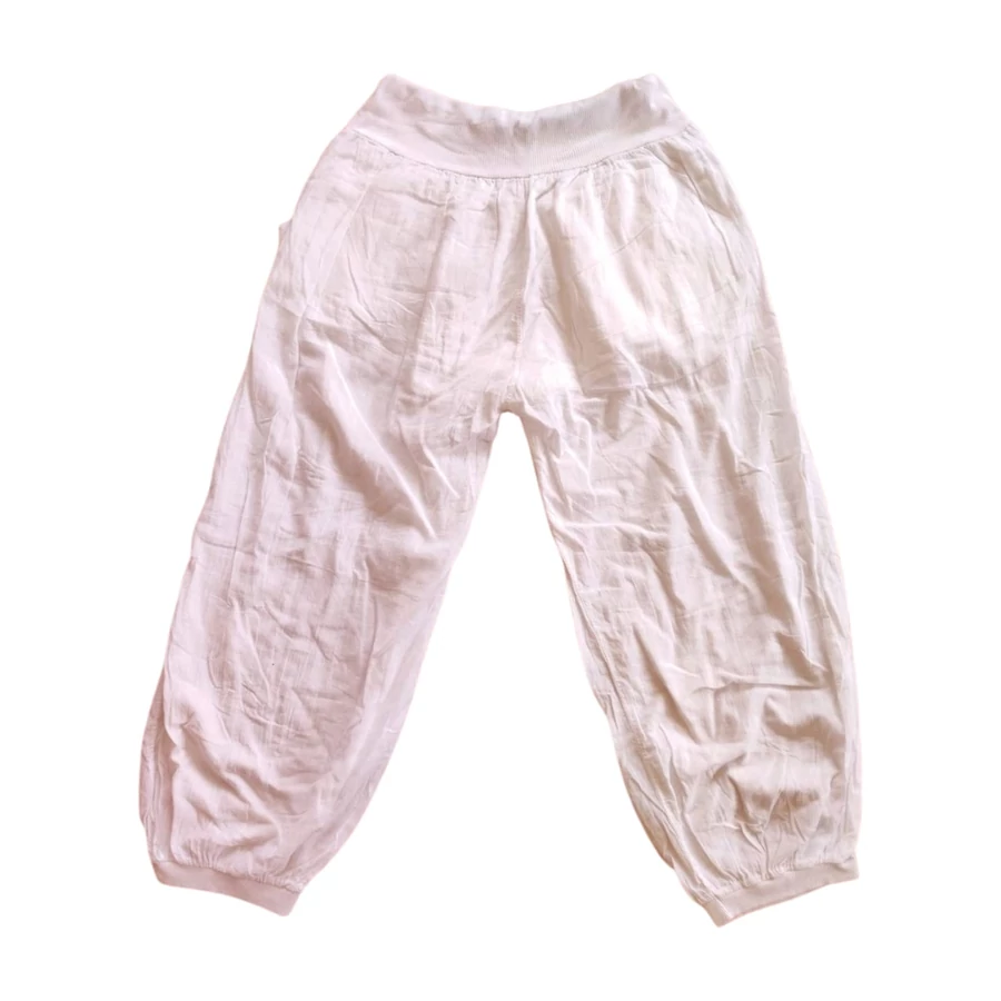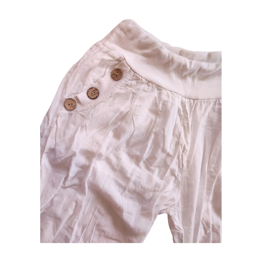 Ez a fehér vékony női háremnadrág puha, vékony, jól szellőző pamut anyagból készült, amely kényelmessé teszi a meleg nyári napokat. A dereka magasított és rugalmas, a szára alul gumis, így jól mutat egy nyári papuccsal vagy szandállal. Bátran kombinálható spagetti pántos toppal vagy testhez álló felsőkkel. Ez a darab átlagos testalkatú hölgyeknek ajánlott.
