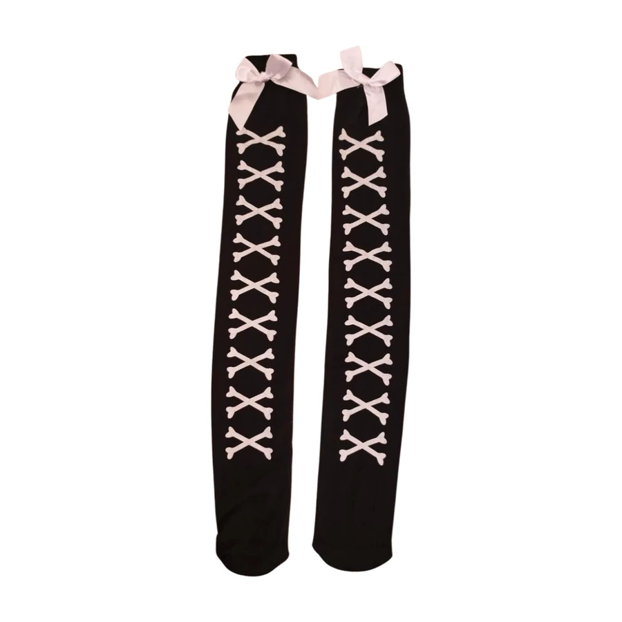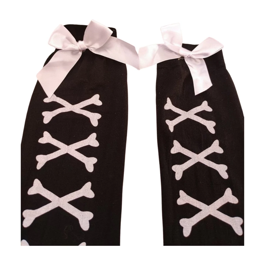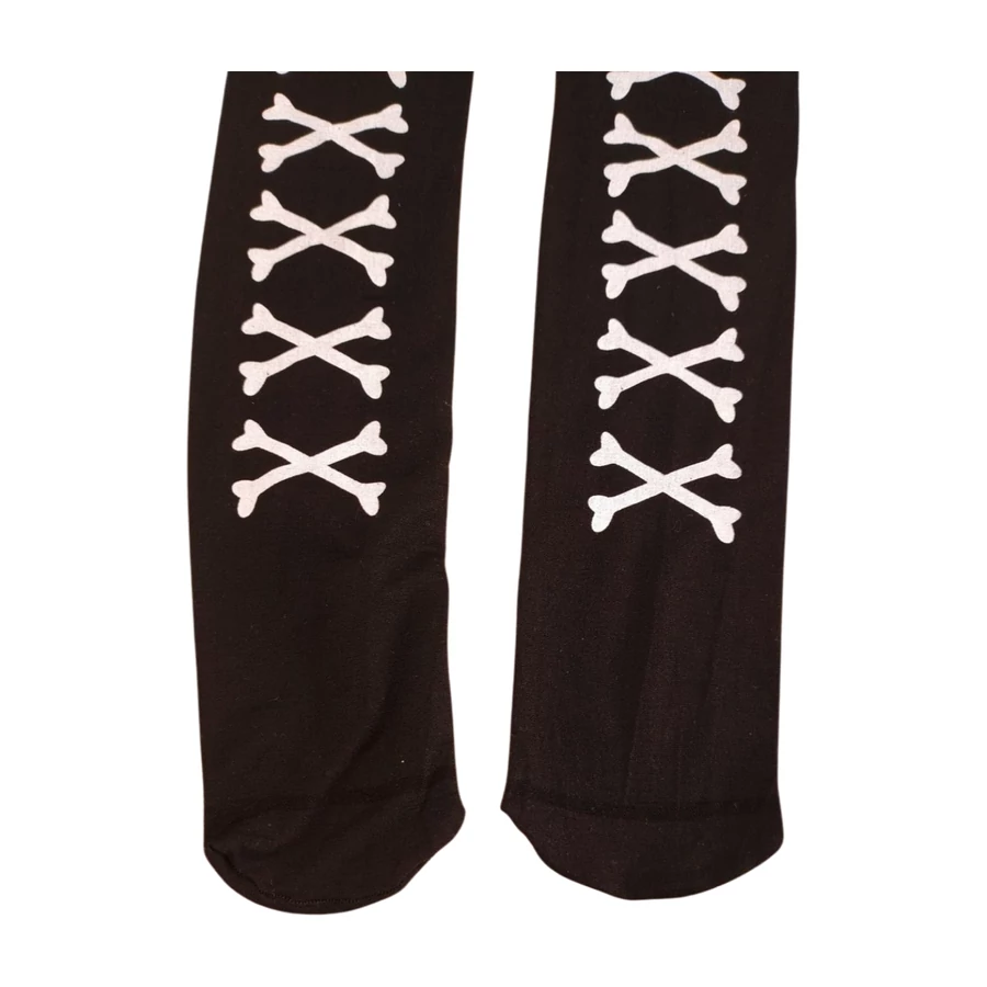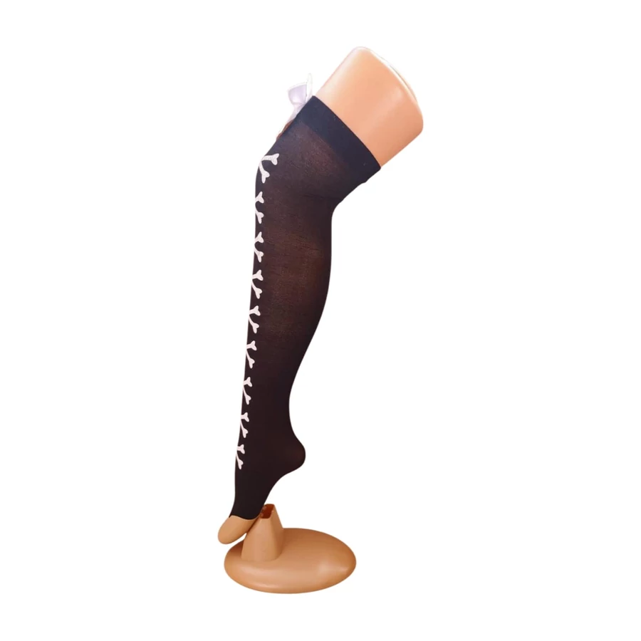 Ez a fekete csont mintás női combharisnya kényelmes, rugalmas darab, amely izgalmas kiegészítő lehet, ha Halloween buliba készülsz vagy csak szereted az ilyen játékos darabokat. Praktikus fazonja combközépig ér, így sokoldalúan hordható. Anyaga közepesen vastag.