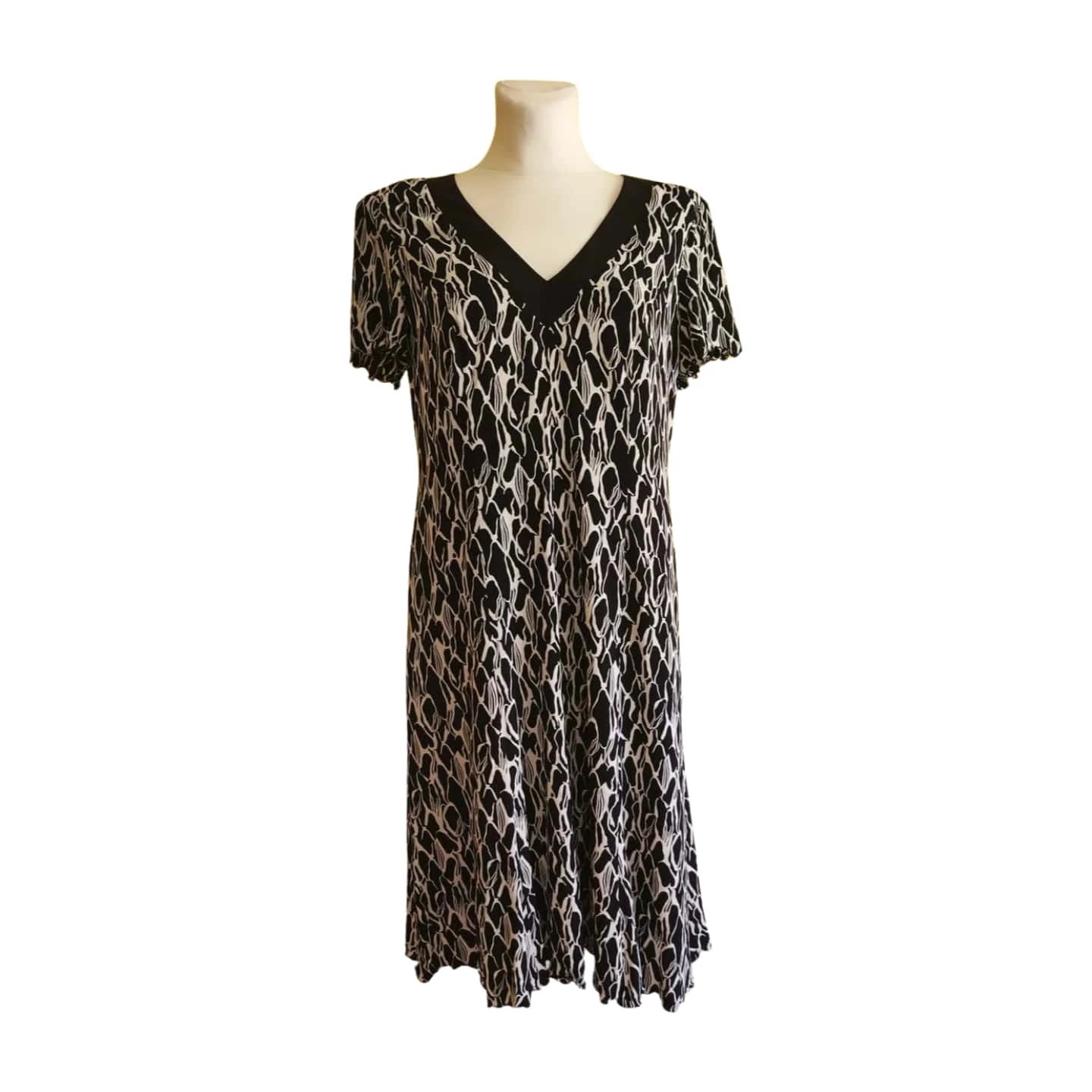 Ez a fekete és fehér mintás női ruha egy nagyon csinos, finom nyári darab. Anyaga puha, lenge, enyhén fényes viszkóz, amely jól szellőzik. Fazonja klasszikus, örök divat, harang esésű szoknyával. Jól kombinálható bármilyen nyári kiegészítővel. A hétköznapokban is stílusos, nőies megjelenést biztosít. Ez a darab átlagos és erősebb alkatú hölgyeknek ajánlott.