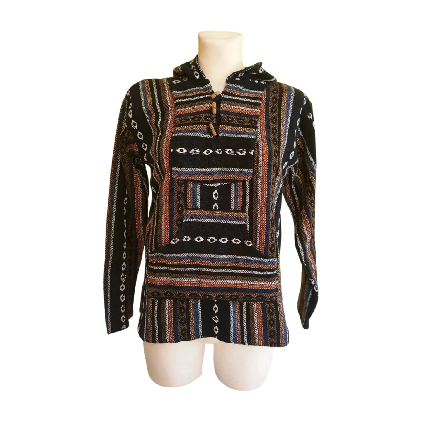 Ez a fekete mintás bohém női pulóver egy nagyszerű darab, ami jól kombinálható egy kényelmes farmerrel vagy laza kiegészítőkkel. Strapabíró pamut anyaga miatt nagyon sokoldalú viselet. Fazonja klasszikus, kapucnis. Kiváló választás egy hétköznapi szetthez vagy kikapcsolódáshoz, de sportos öltözetnek is megfelelő. Ajánlott átlagos alkatú hölgyeknek.