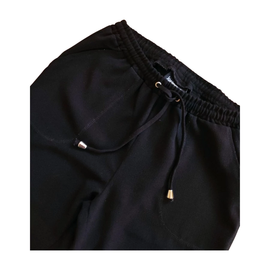 Ez a Janina fekete vékony női nadrág puha, elasztikus, jól szellőző anyagból készült, amely kényelmessé teszi a tavaszi-nyári napokat. A dereka és a szára is rugalmas, gumis, így nagyon komfortos viselet. Bátran kombinálható egy nyári toppal vagy sportos felsővel is. Ez a darab átlagos és vékonyabb testalkatú hölgyeknek ajánlott.