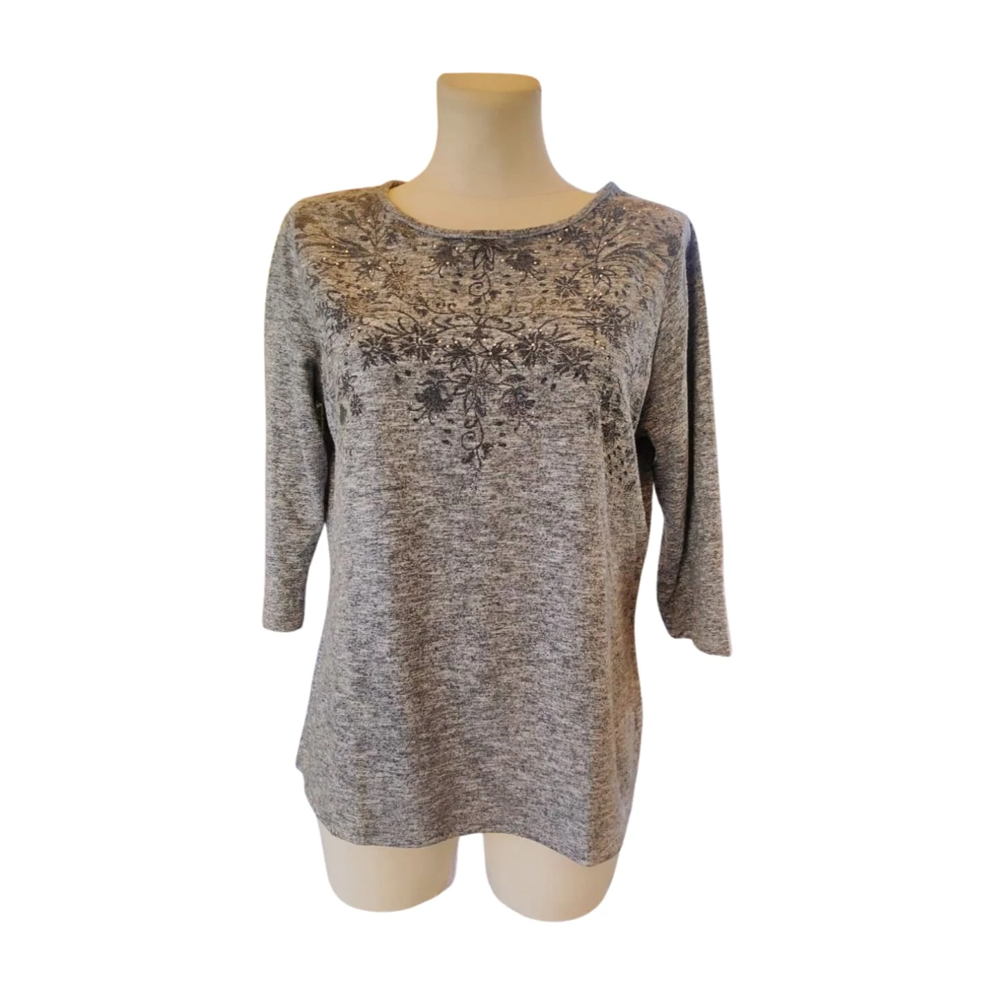 Ez a Janina szürke női pulóver egy nagyszerű darab, ami jól kombinálható egy kényelmes farmerrel vagy elegáns kiegészítőkkel. Nagyon puha, kötött anyaga miatt komfortos viselet. Fazonja klasszikus, 3/4-es ujjú. A mintája strasszokkal díszített, finom megjelenést kölcsönöz. Kiváló választás egy hétköznapi szetthez vagy kikapcsolódáshoz, de nőies kiegészítőkkel is megfelelő. Ajánlott átlagos alkatú hölgyeknek.