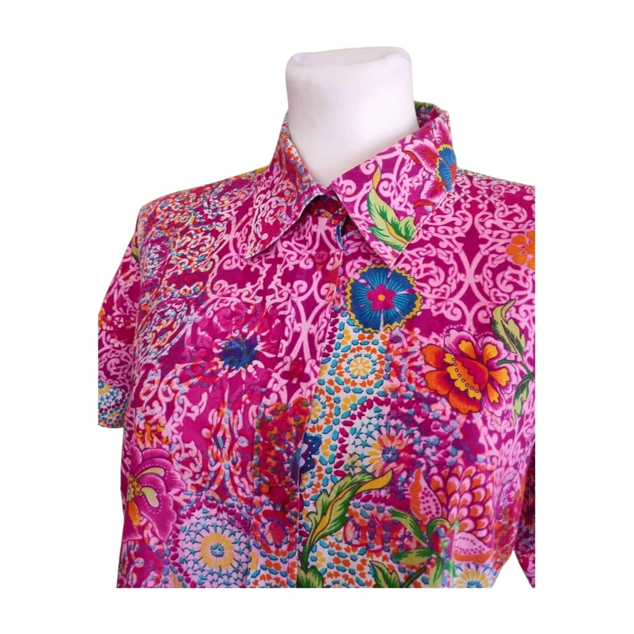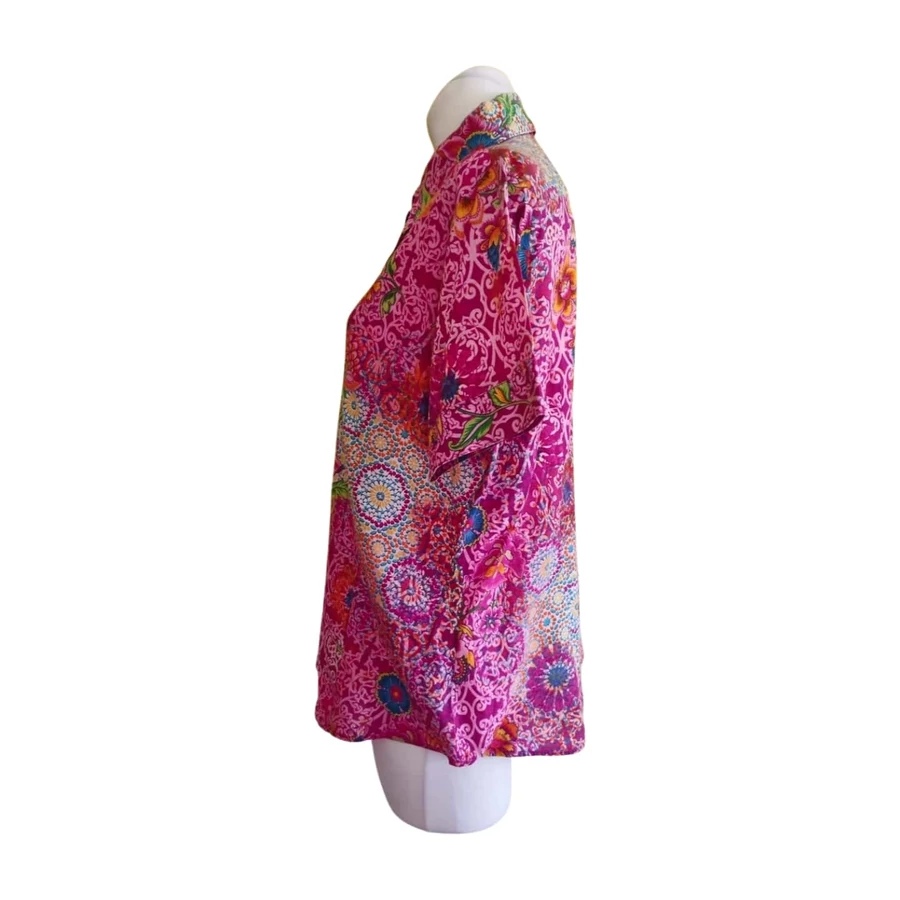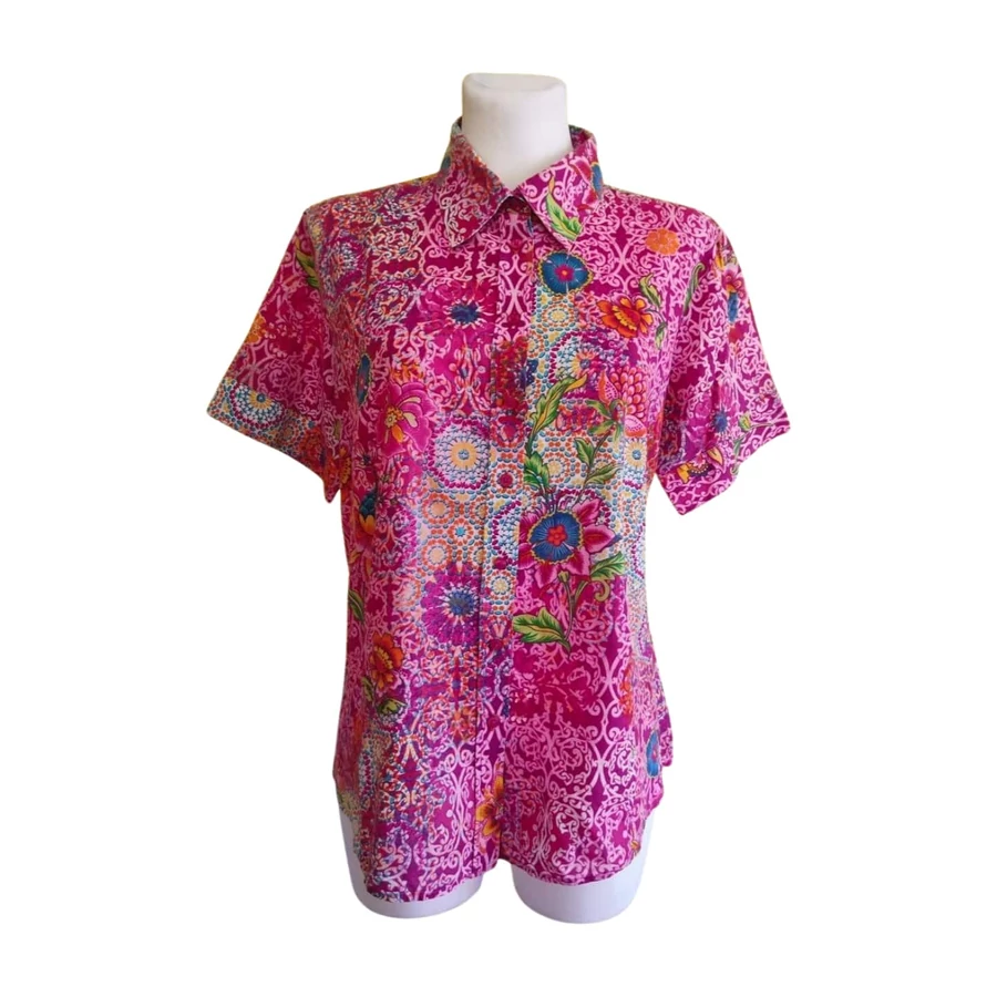 Ez a Milano Donna rózsaszín mintás női rövid ujjú blúz egy csinos, nőies darab, amely kombinálható több stílusú ruhadarabbal, legyen az laza vagy elegánsabb. Rugalmas puha, tiszta pamut anyaga kényelmes viseletté teszi. Jól mutat egy farmerrel ugyanúgy, mint egy nőies szett részeként. Fazonja karcsúsított. Ajánlott átlagos alkatú hölgyeknek.