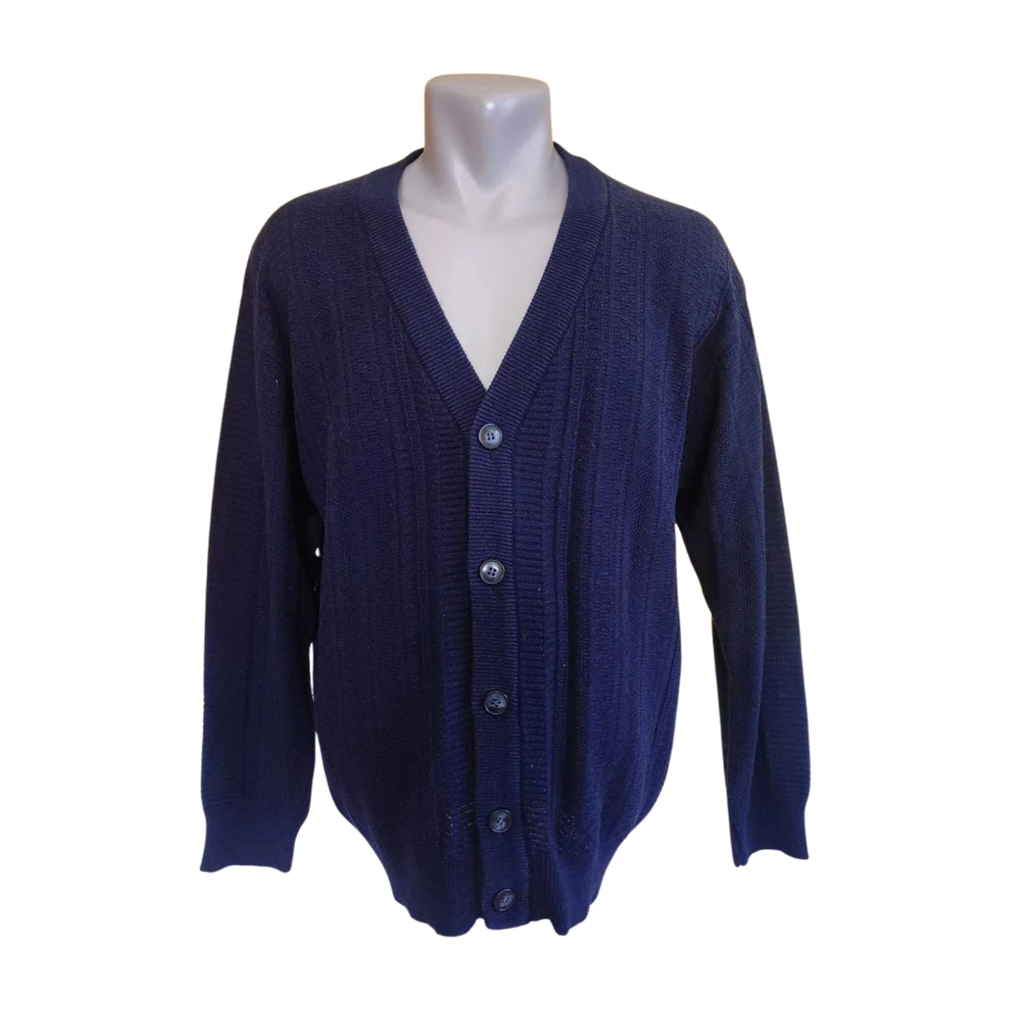 Ez a New Wave sötétkék férfi kardigán egy nagyszerű alapdarab, amely jól illik elegáns és hétköznapi kiegészítőkhöz. Anyaga puha és rugalmas kevert pamut, amely kényelmessé teszi a viselést. Fazonja klasszikus, gombsoros. Kiváló választás egy hétköznapi szetthez vagy elegáns öltözethez. Ajánlott átlagos alkatú férfiaknak.