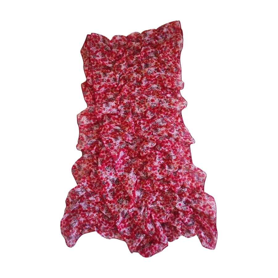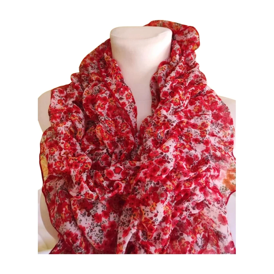 Ez a piros virágmintás női sál egy nagyon szép, praktikus kiegészítő, amely hosszabb mérete miatt többféle módon hordható. A színe kellemes, mintája vidám és jól kombinálható több stílusú ruhadarabbal. A sál középen behúzott, amelynek köszönhetően fodros fazonú. Anyaga vékony, így inkább az átmeneti időben érdemes hordani.