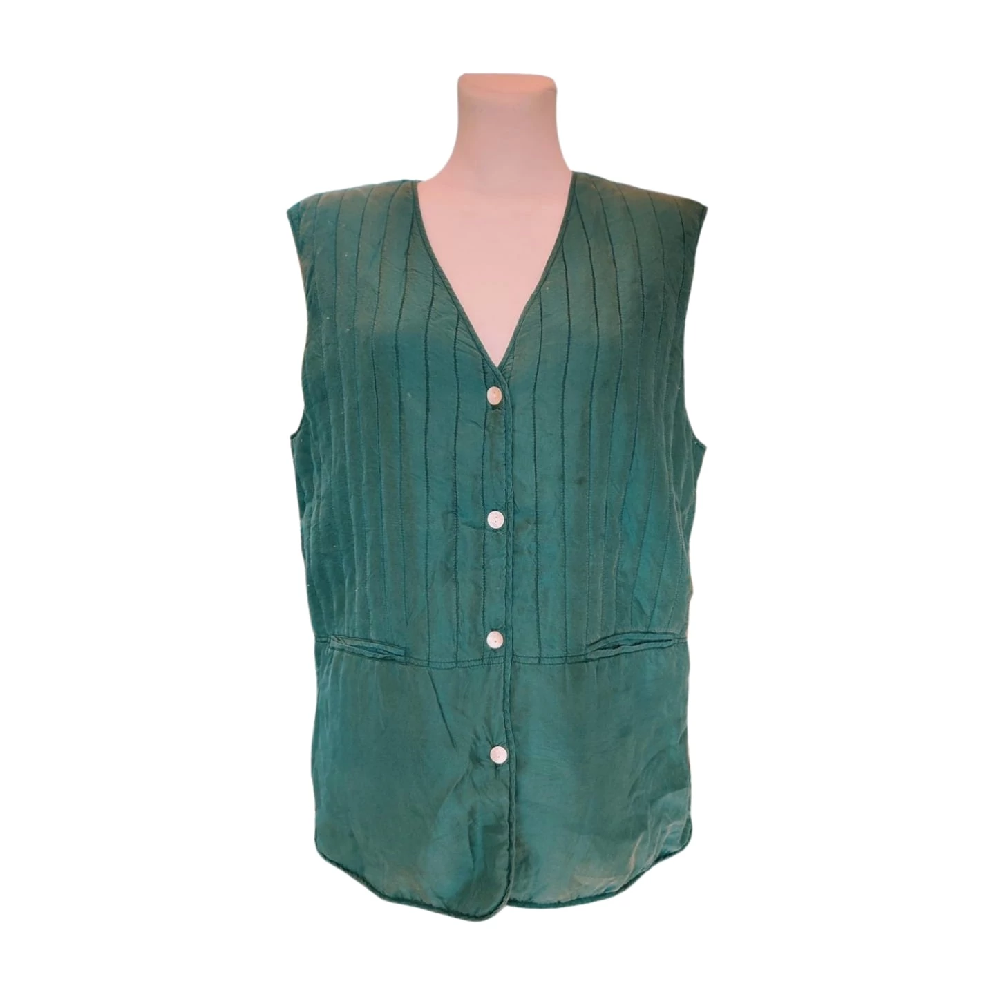 Ez a Surprise sötétzöld vékony női mellény egy átmeneti, vékonyabb, amely kiváló választás az őszi-tavaszi ruhatáradba. Nőies és egyben praktikus, amely a hétköznapokban kényelmes viselet. Steppelt, ami miatt jó tartású, strapabíró. Nem vízálló az anyaga és akár kabát alatt is hordható vagy beltérben pulóver felett a hűvös napokon. Igazi vintage darab, aminek az anyaga selyemből készült. Ajánlott átlagos és erősebb alkatú hölgyeknek.